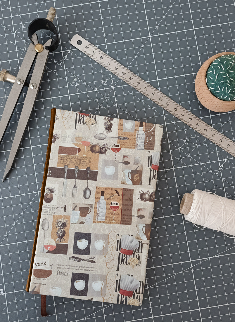 Cette couverture célèbre l’art de la cuisine à travers un collage de motifs gourmands : ustensiles, bouteilles, fruits, café et clins d’œil à la gastronomie italienne. Chaleureuse et conviviale, elle donne au carnet une allure savoureuse et inspirante.