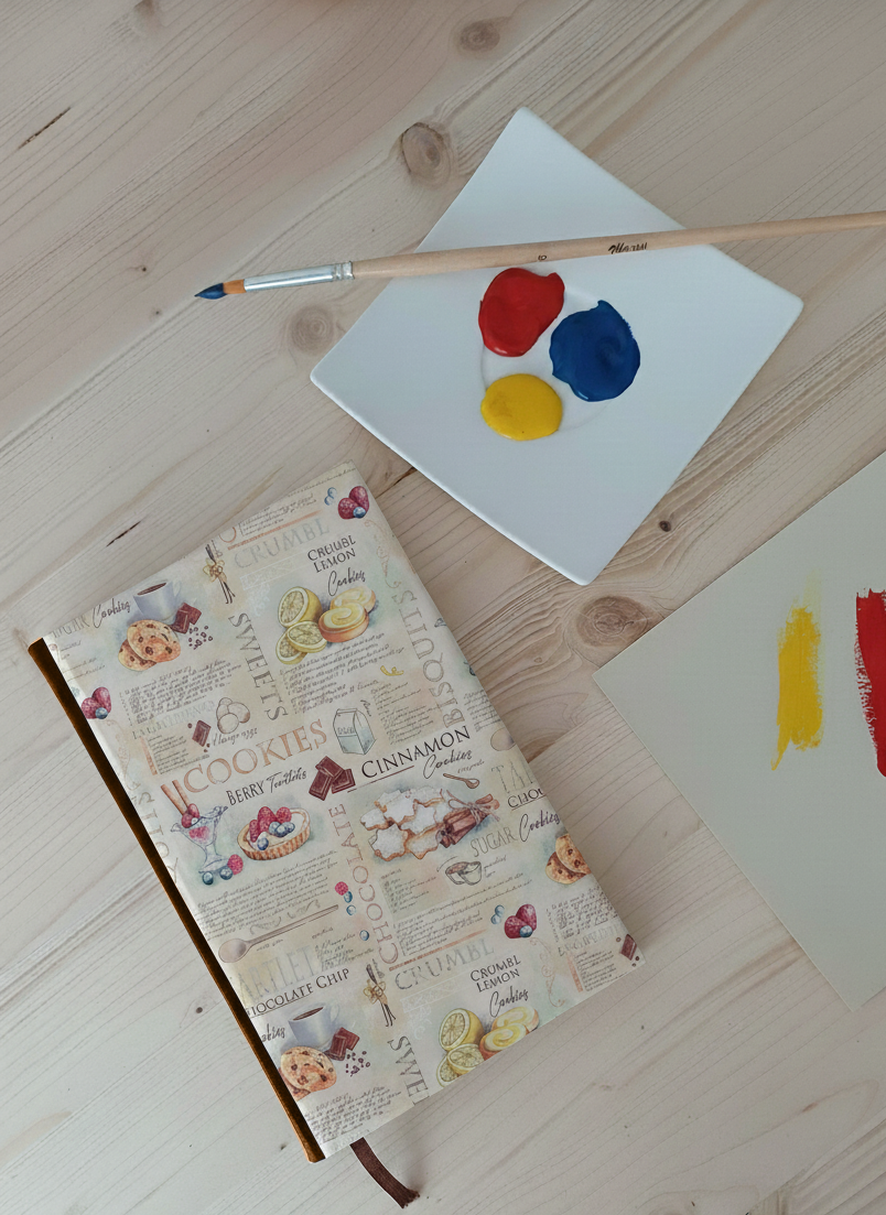 Cette couverture gourmande illustre recettes et douceurs sucrées : cookies, tartelettes, chocolat et agrumes se mêlent à des notes manuscrites façon cahier de recettes. Chaleureux et appétissant, son design donne au carnet un charme convivial et créatif.
