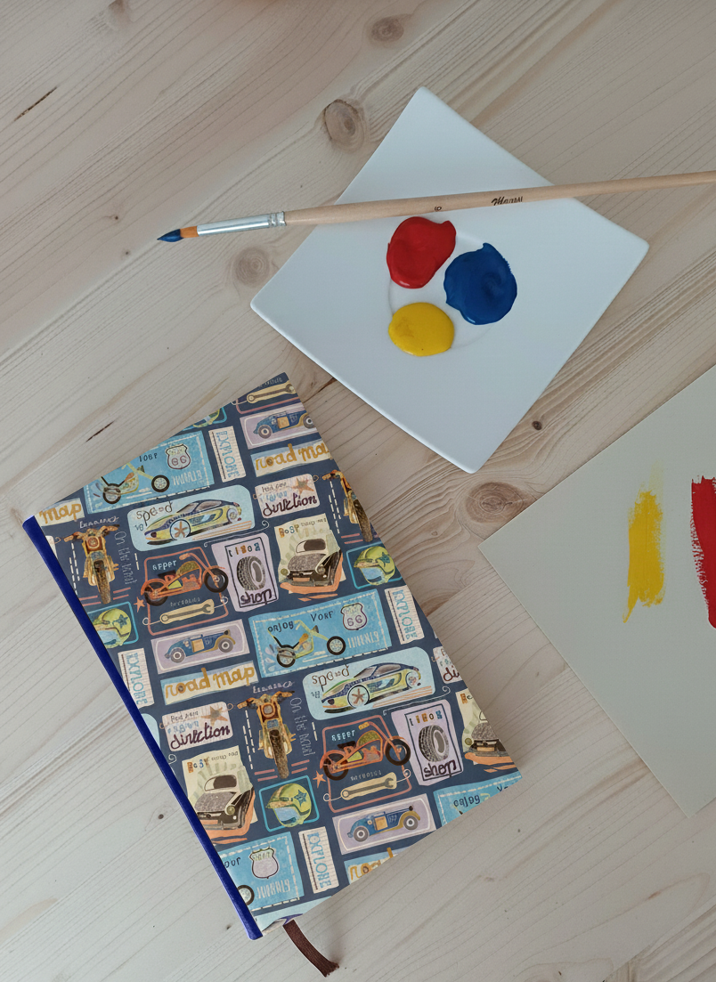 Cette couverture dynamique s’inspire de l’univers rétro des routes et des garages, mêlant motos, voitures vintage et panneaux colorés façon Route 66. Ludique et pleine d’énergie, elle confère au carnet un style aventurier et original.