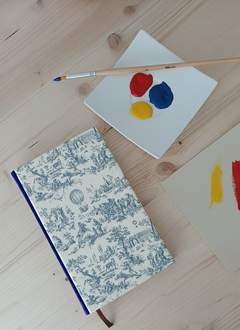 Cette couverture revisite l’élégance intemporelle de la toile de Jouy avec ses scènes bucoliques et ses motifs détaillés en bleu sur fond blanc. Raffinée et classique, elle confère au carnet un charme authentique, idéal pour les amateurs d’esthétique vintage et poétique.