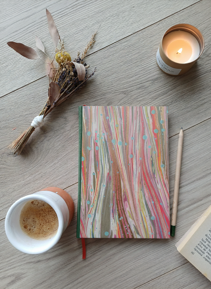 Cette couverture se distingue par un motif marbré aux couleurs vives et fluides, où se mêlent des traits ondoyants de rouge, rose, or et vert, ponctués de bulles turquoise. Un design artistique et dynamique qui donne au carnet une allure unique et pleine d’énergie créative.